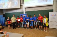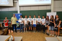 They had five hours during which they tried to solve 3 different tasks. Most of them stayed until the very end but for couple of the contestants it took a lot less to finish. Live results were streamed during the whole time and all the teams were cheering for their members. In one of the classrooms team leaders would translate the questions to the organizers in case the contestants had any difficulties. At around 2 PM they exited the classrooms and were awaited by some of the Slovenian media. Everyone was eager to hear about their impressions.